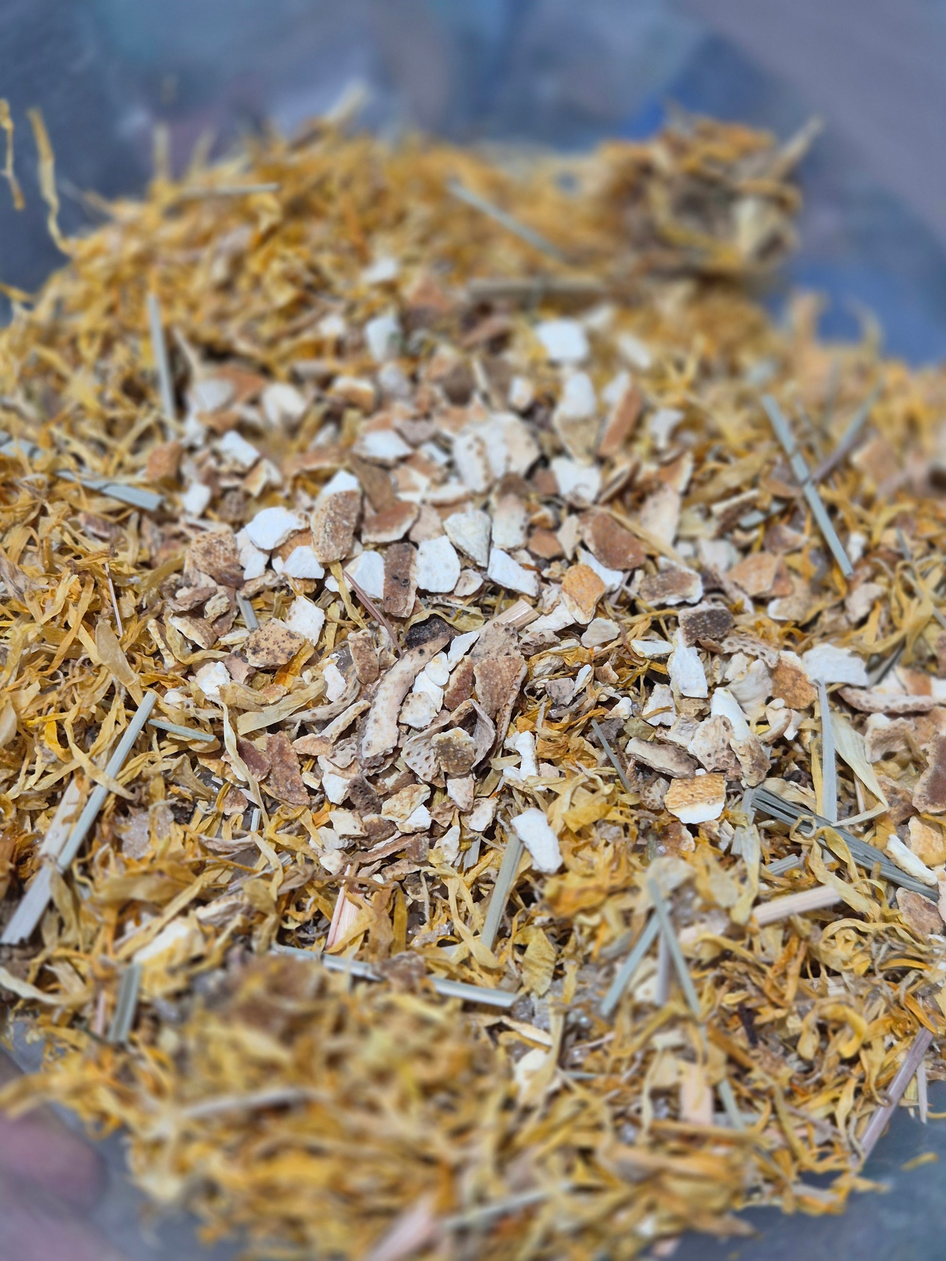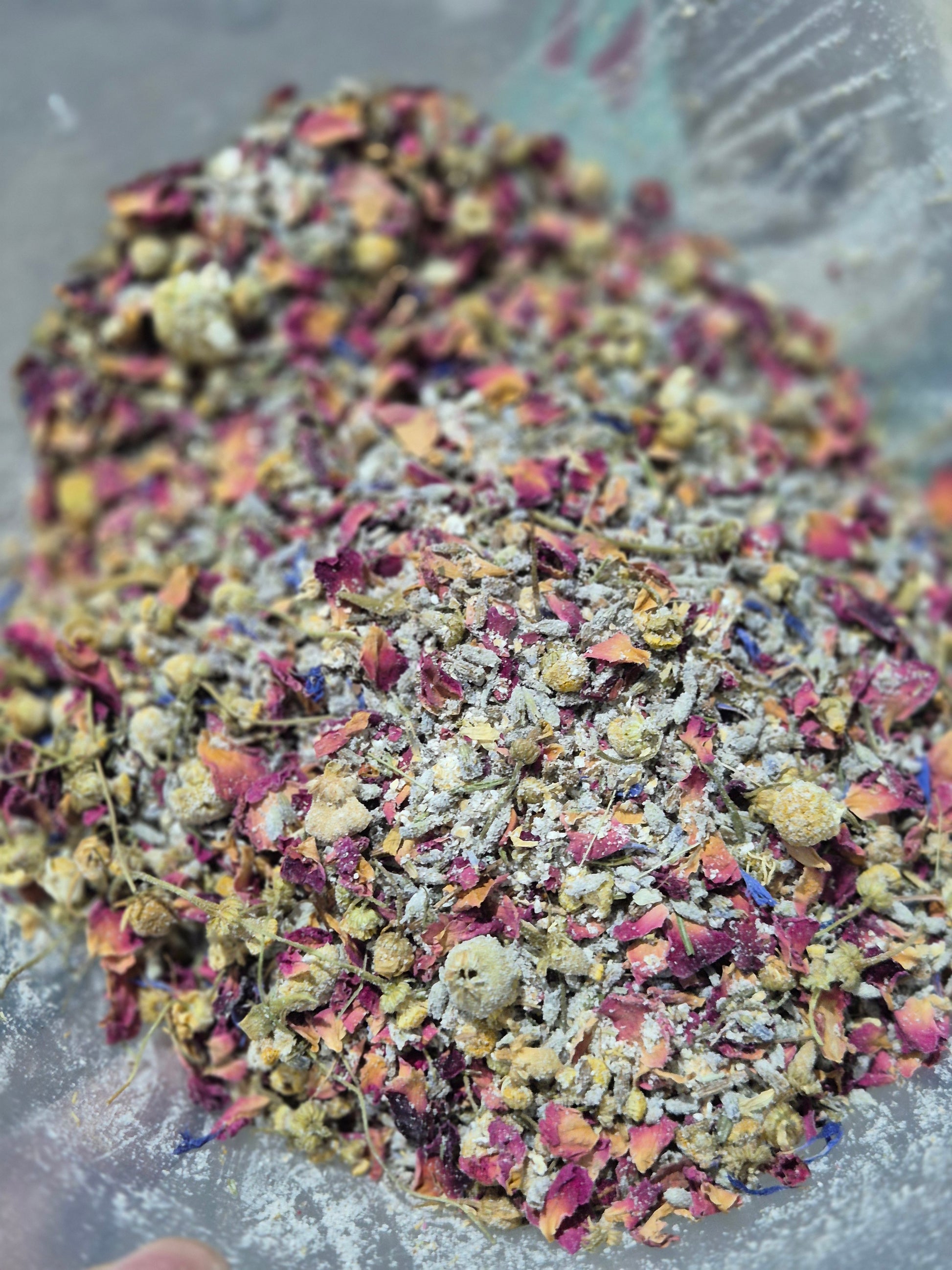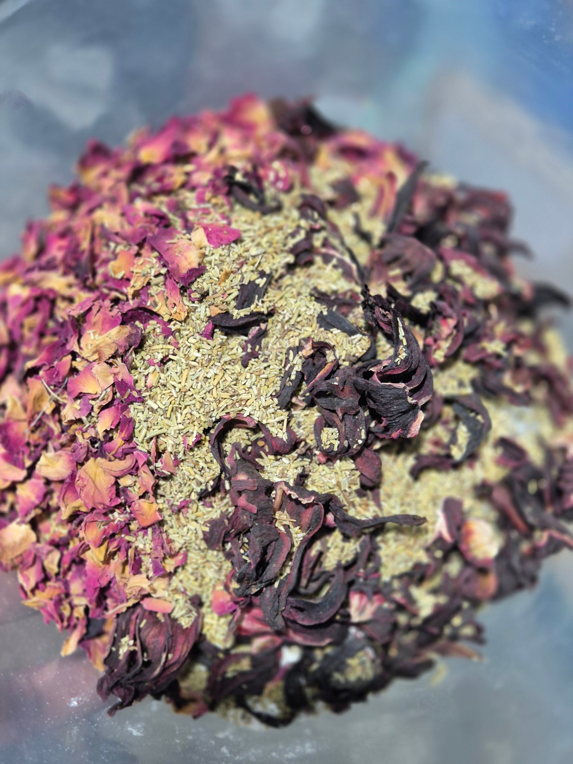 A grounding blend of rose buds, hibiscus, soft herbs, Epsom salt and silky kaolin clay. Scented with rose geranium and a touch of cedarwood, this blend encourages balance, emotional ease and gentle restoration.